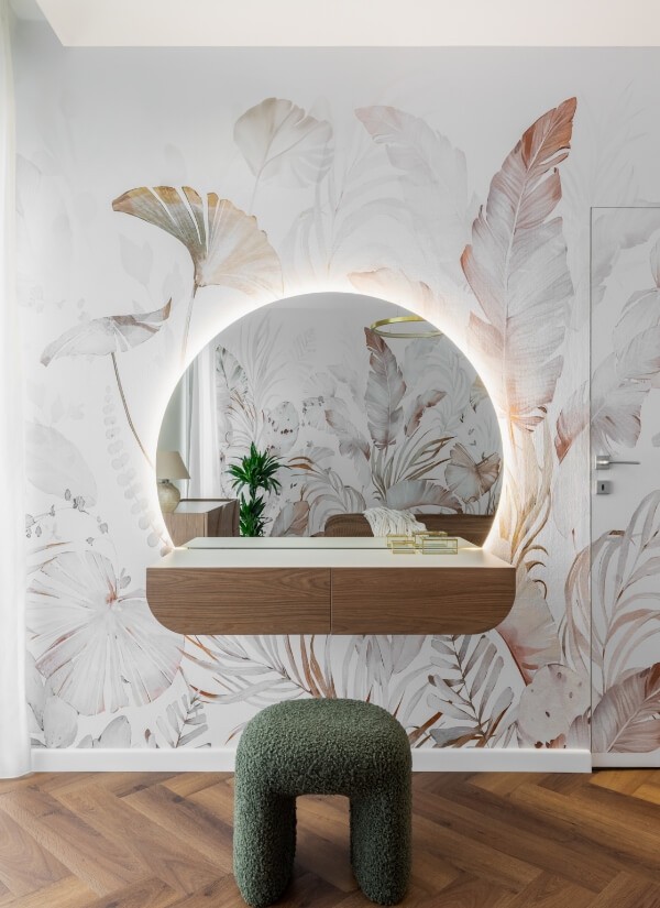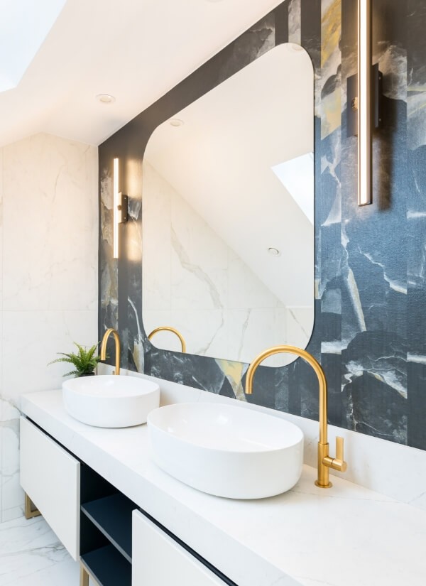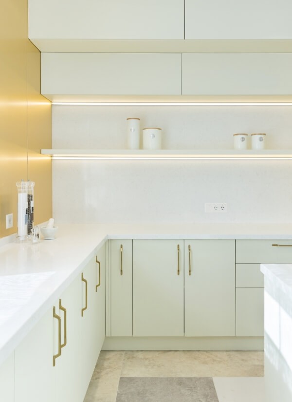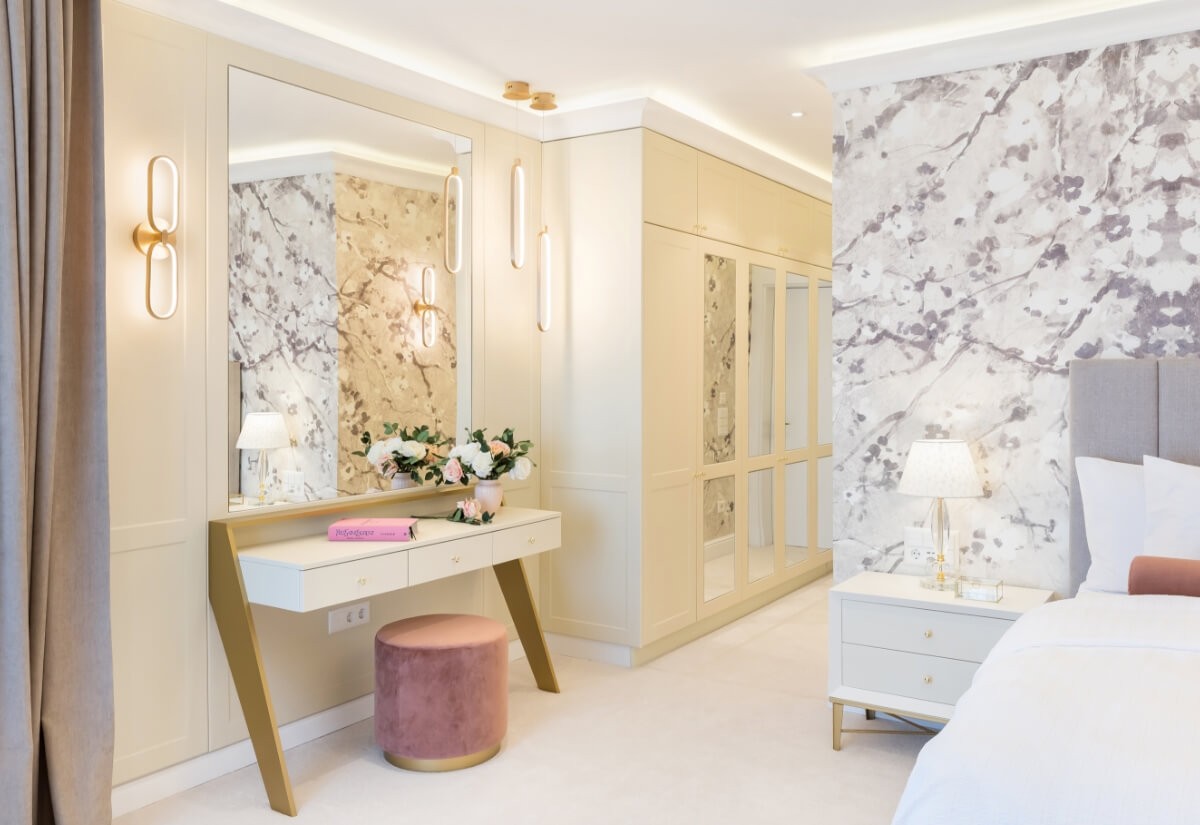 Linii curate, texturi moi și accente aurii – un spațiu gândit să aducă echilibru și lumină.